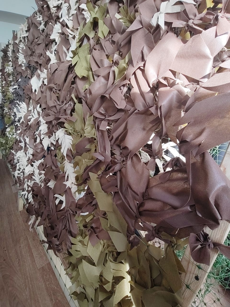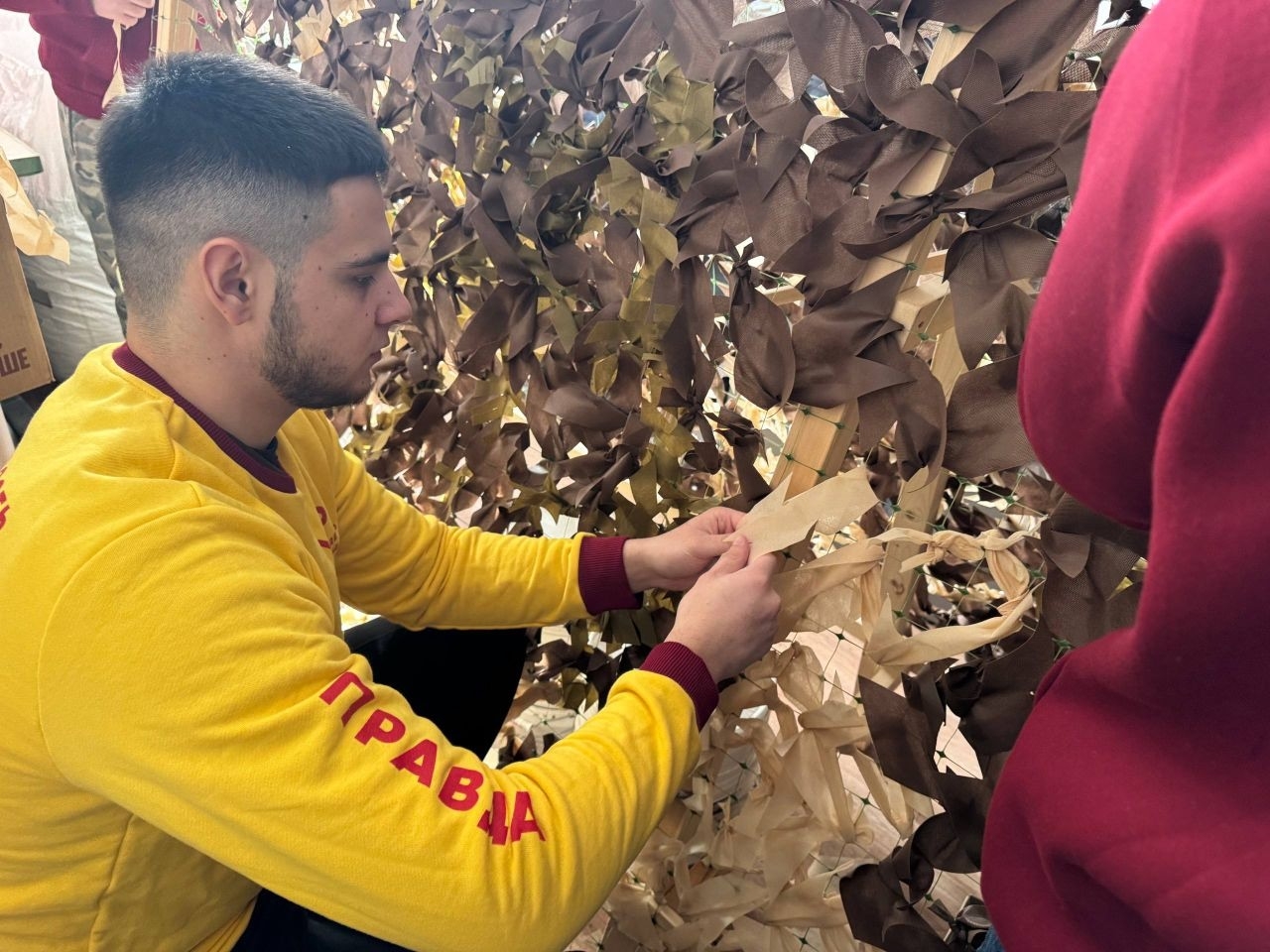 Несколько дней подряд наши ребята собирались вместе, чтобы завершить крупную сеть размером 3 на 6 метров. Каждая вплетённая лента – вклад в безопасность бойцов, находящихся на линии боевого соприкосновения. Сеть подготовили и передали военнослужащему, который после отпуска возвращается в своё подразделение.
